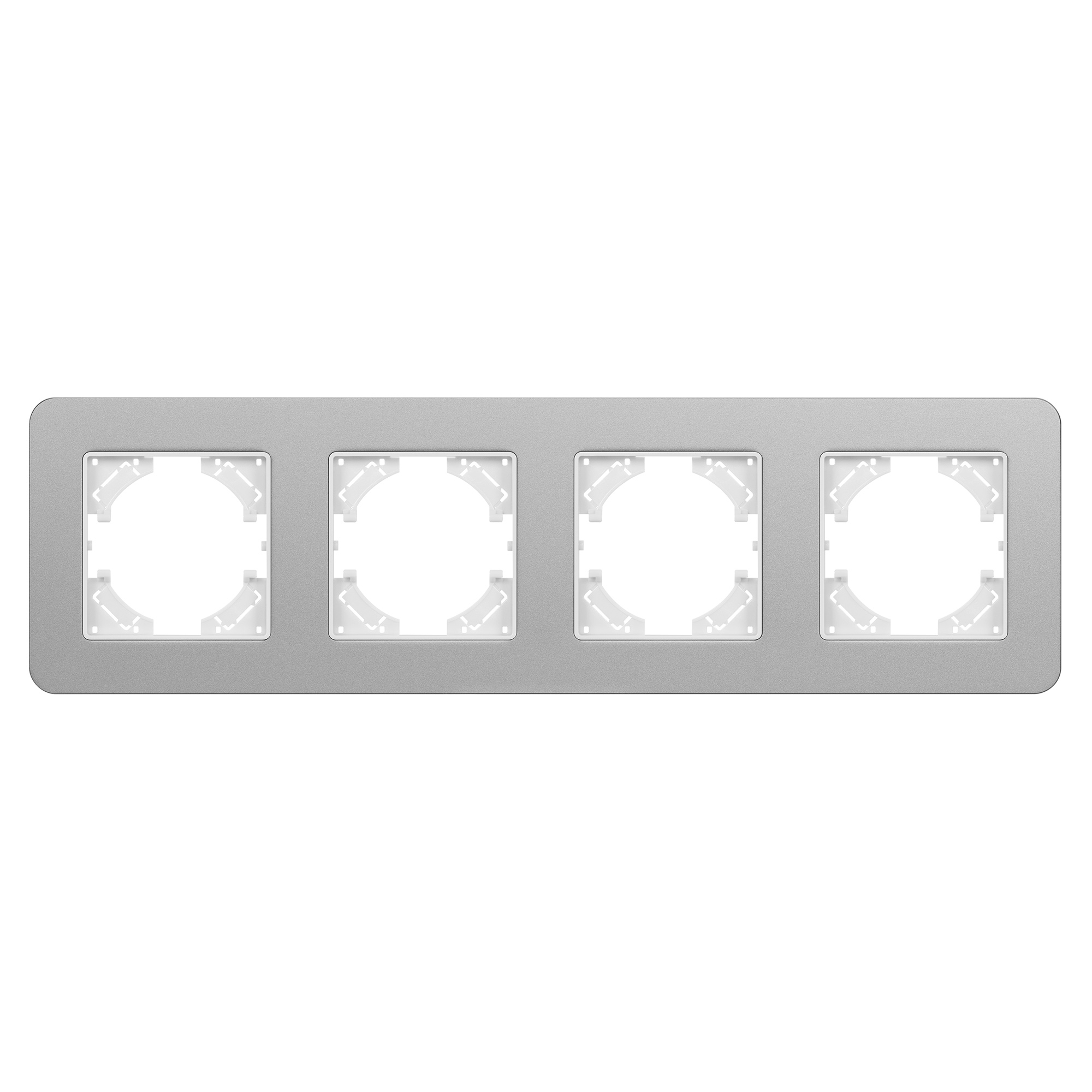 Рамка алюминиевая на 4 поста, под встраиваемый механизм. Цвет - серебристый с Soft-Touch покрытием. Среднего уровня герметичности IP20. Ориентация монтажа - горизонтальная (основным ориентиром служат посадочные выступы для накладки механизма).